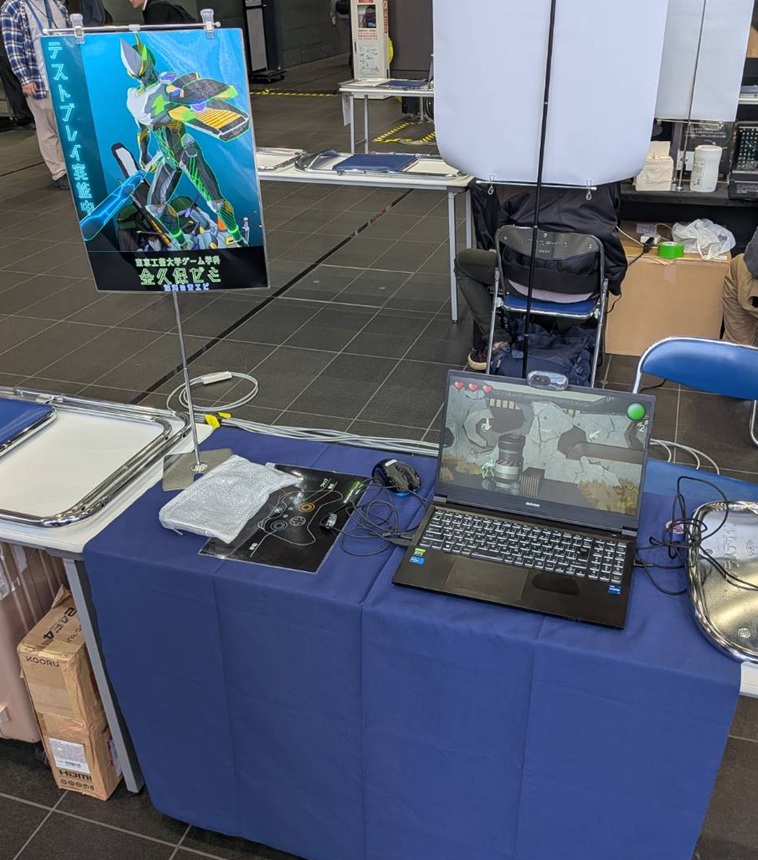 あいにくの曇り空となりましたが、会場は朝から多くの来場者で賑わい、学生ブースにも絶え間なく人が訪れました。来場者の方々からは「発想が面白い」「操作がシンプルで遊びやすい」などの好評をいただいたほか、改善点や新しいアイデアに関する貴重なご意見も数多く寄せられました。学生たちは実際にプレイヤーの反応を目の当たりにすることで、自分たちの作品を客観的に見つめ直す良い機会となりました。