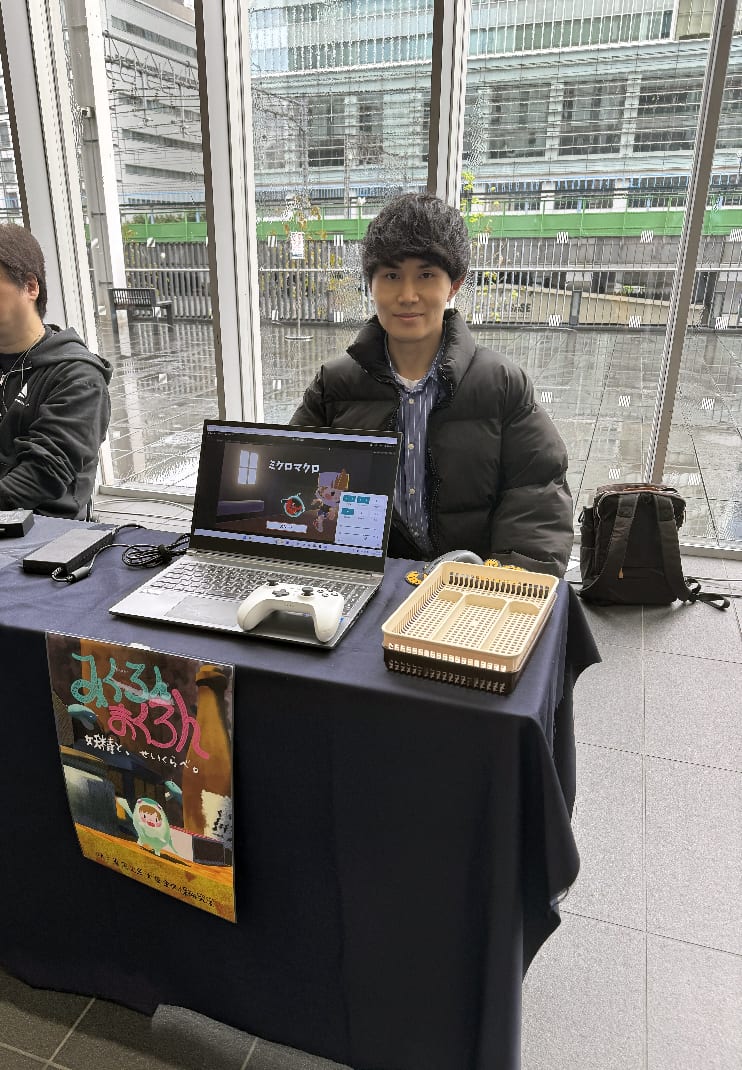 本学からは、4年生が卒業制作として取り組んでいるオリジナルゲーム「みくろんまくろん」と「PROJECT ROOP」を展示しました。学生たちは、限られた制作期間の中で、企画・デザイン・プログラム・サウンドなど、すべての工程を自らの手で完成させました。当日はブースの設営からデモプレイの説明までを自分たちで担当し、開発者としての責任と誇りを持ってイベントに臨みました。