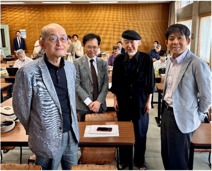 写真は、このシンポジウムの登壇をお引き受けくださった方々とわたしです。左から吉岡洋先生(京都芸術大学)、小川真人、今回司会の労を執っていただいた山田忠彰先生(日本女子大学)、喜屋武盛也先生(沖縄芸術大学)です。