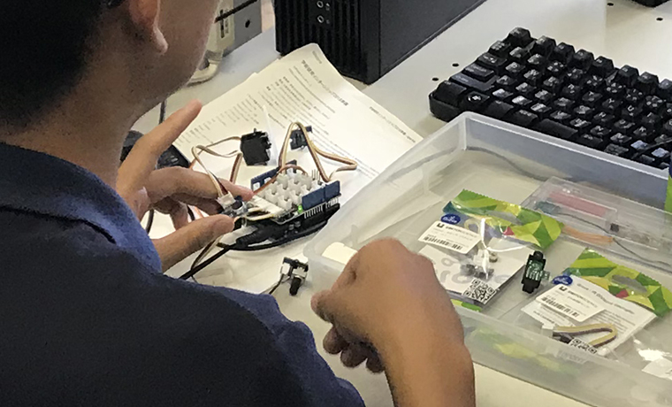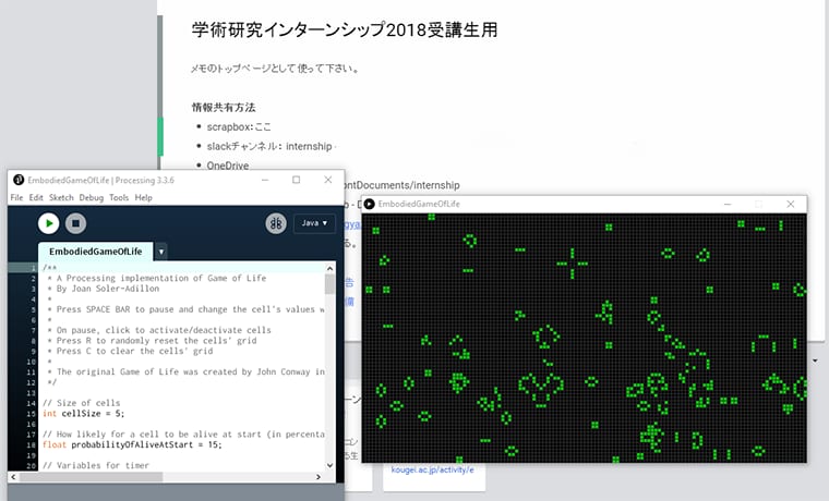 例えば人工生命研究室では5日間に渡り、「フィジカルコンピューティングによる生きているスマートホームの開発」というタイトルで、ArduinoマイコンやIoTデバイスと人工生命プログラムを連携させたスマートホームシステムの開発に取り組んでいます。上部ギャラリーはそちらの様子です。
