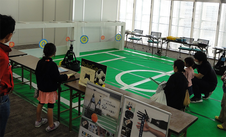 知能化システム研究室では複数台のパルロを使用した案内ロボットの研究についての展示、ロボットビジョン研究室ではサッカーロボットの展示を行い、どちらも大盛況でした。